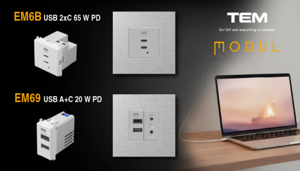 The MODUL USB chargers are available as 1-module (20 W) and 2-module (65 W) units